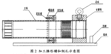 的定位板和支撐件支撐工件,定位板上設(shè)有螺栓孔,通過(guò)內(nèi)六角螺柱將工件的中部夾緊固定,支撐件對(duì)工件的端部進(jìn)行支撐,該工裝確定加工槽的位置是通過(guò)定位板